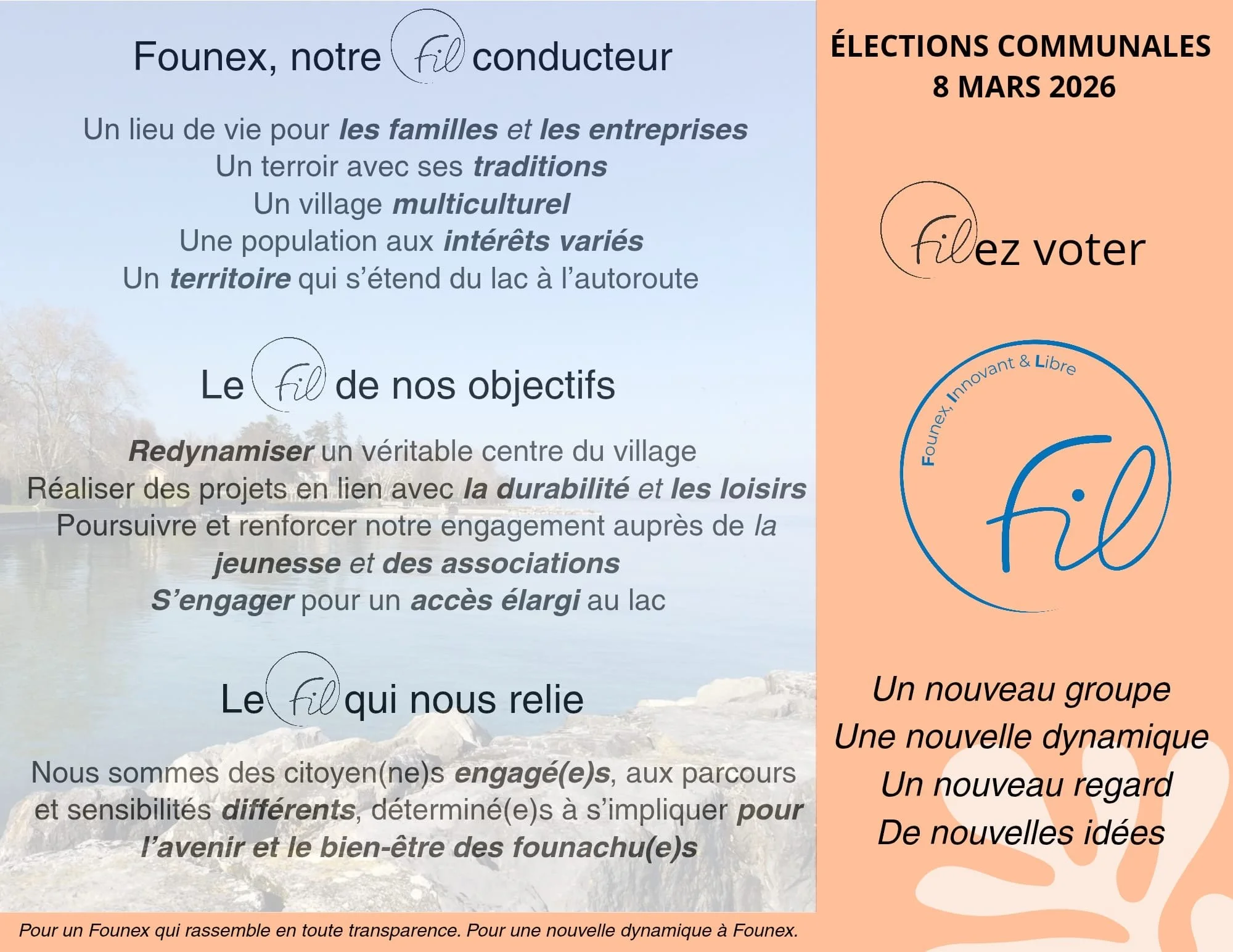 En plaçant l’écoute, la liberté de pensée et l’action concrète au cœur de son engagement, FIL souhaite construire avec vous un Founex vivant, harmonieux et solidaire, aujourd’hui et pour les générations futures.